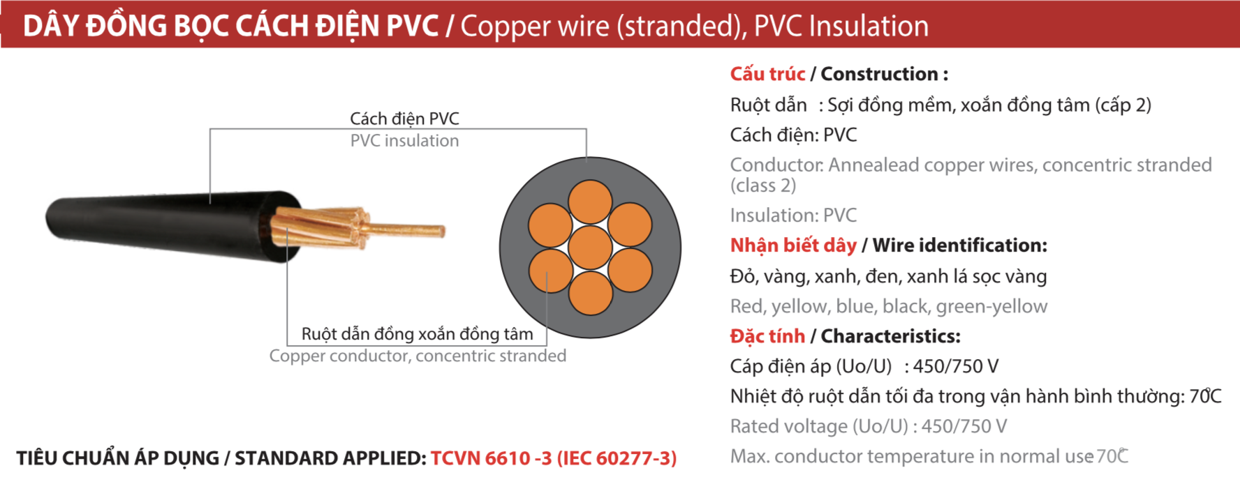 Dây đơn cứng, ruột đồng, cách điện PVC